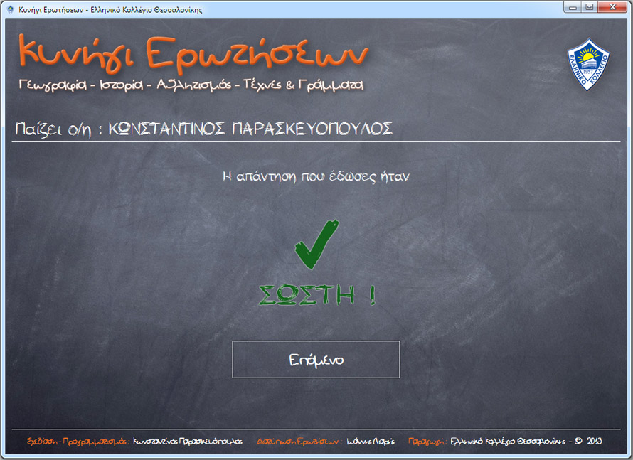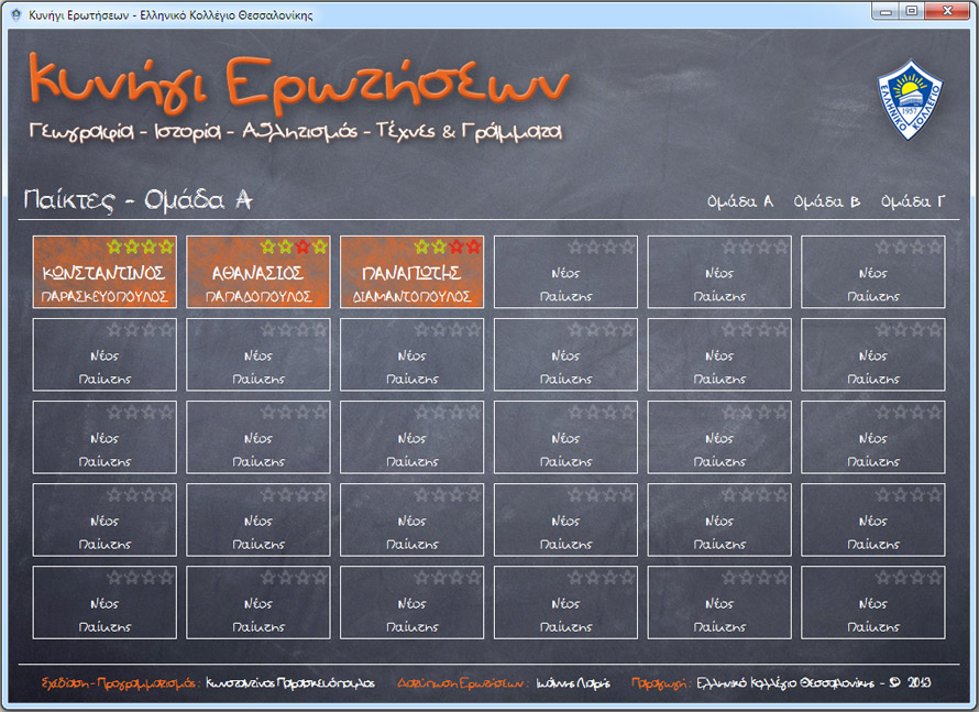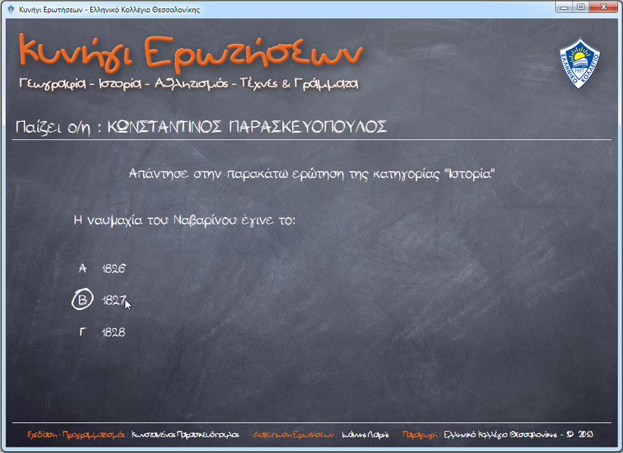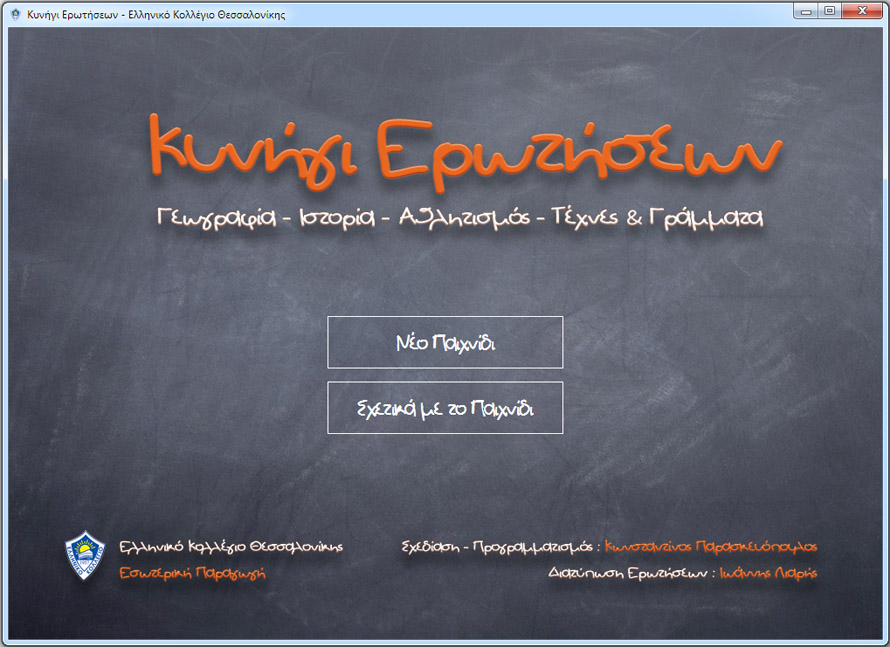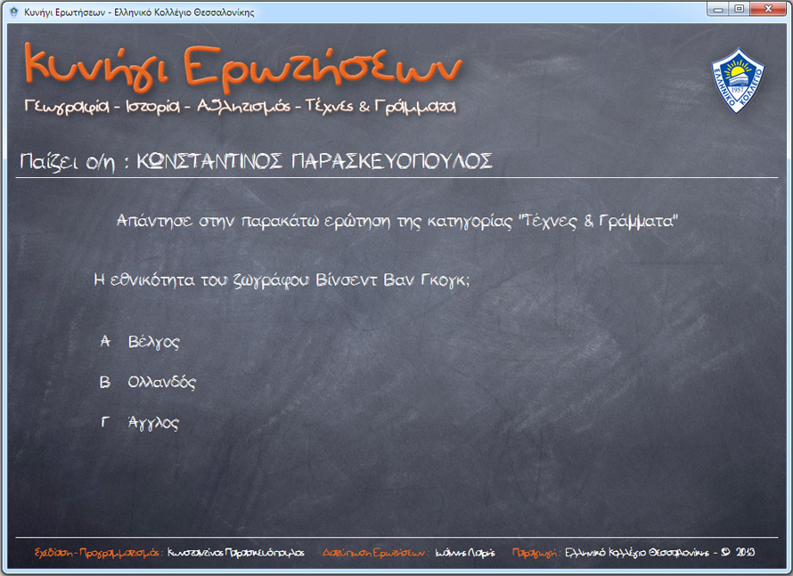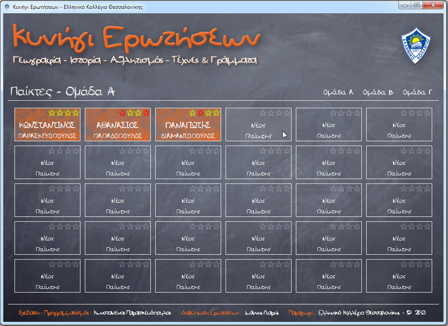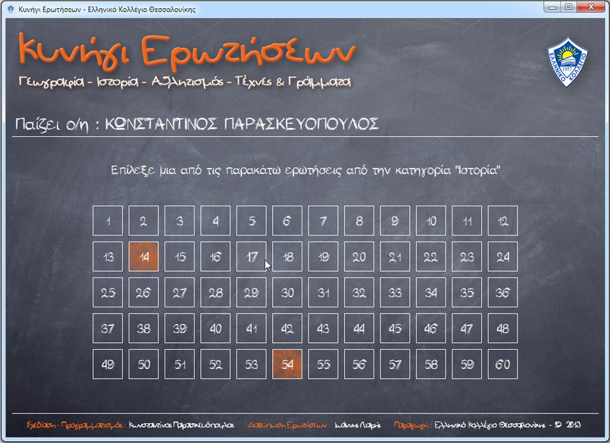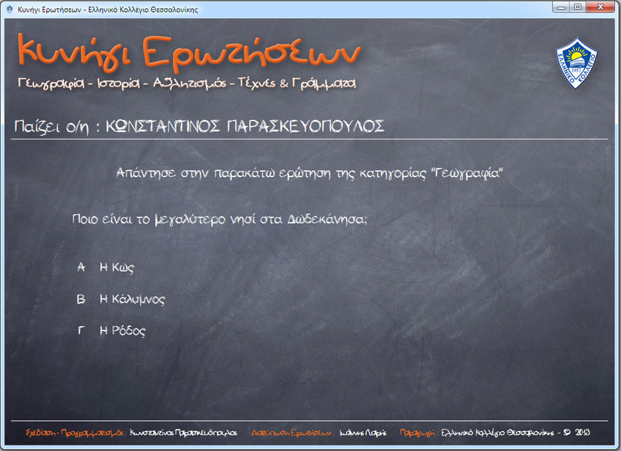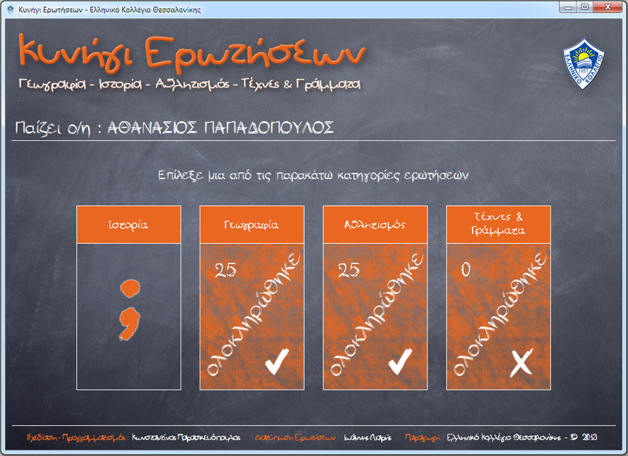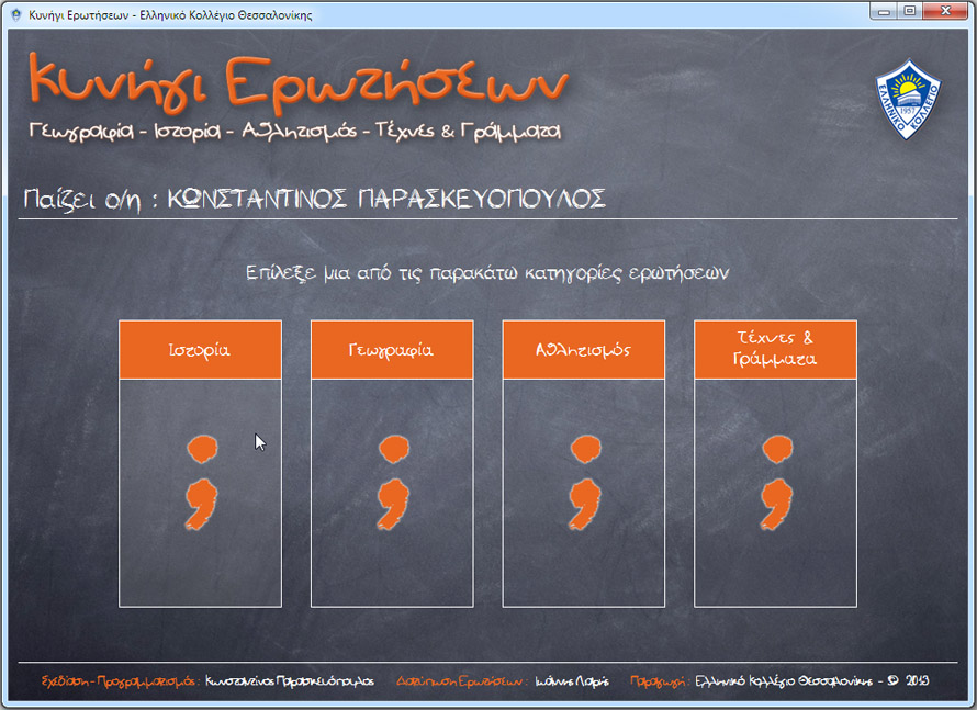 Δημιουργία ηλεκτρονικού εκπαιδευτικού παιχνιδιού για διαδραστικούς πίνακες "Κυνήγι Ερωτήσεων". Είναι ένα παιχνίδι γενικών γνώσεων με ερωτήσεις Ιστορίας, Γεωγραφίας, Αθλητισμού και Τεχνών & Γραμμάτων. Το παιχνίδι είναι γραμμένο σε γλώσσα Java και χρησιμοποιείται ως ψυχαγωγική δραστηριότητα σε όλες τις τάξεις του Γυμνασίου και του Λυκείου στο Ελληνικό Κολλέγιο Θεσσαλονίκης.